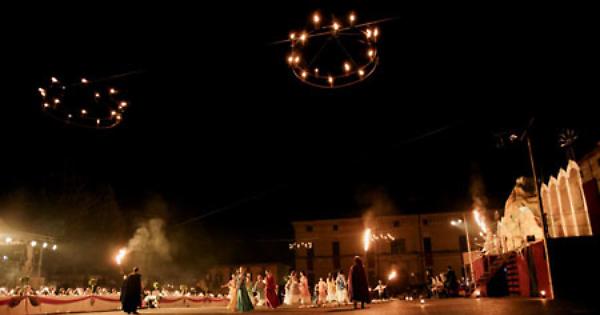 il sabato viene allestito uno sfarzoso e scenografico banchetto rinascimentale per i nobili signori, con pietanze dai ricettari dell’epoca e un grande spettacolo messo in scena dagli artisti isolani con musica dal vivo e giochi di fuoco e pirotecnici;