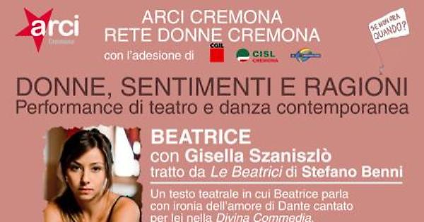 ... Performance di teatro e danza contemporanea ●● BEATRICE ●● con Gisella Szaniszlò tratto da Le Beatrici di Stefano Benni __________________________ Un testo teatrale in cui Beatrice parla con ironia dell’amore di Dante cantato per lei nella Divina Commedia. ●● IL BUIO AVRÀ I TUOI OCCHI ●● a cura di Danzarea Slapstick coreografie e progetto musicale di Monica Farnè danzano Elisa Barbazza, Elisabetta Farnè, Anna Lazzarini, Anna Mantovani, Jesus Prada, Martina Rossetti, Elena Spada __________________________ Performance di danza contemporanea ispirata alla storia d’amore e di passione tra la Regina Didone ed Enea, narrata da Virgilio nel quarto libro dell’Eneide. |