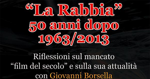 Cremona- 50 anni dopo 1963/2013 la conclusione delle riprese del tanto contestato film di Pasolini e Guareschi, La Rabbia, alla sala conferenze della società Filodrammatici si terrà un'incontro per riflettere sul mancato “film del secolo” e sulla sua attualità, con Giovanni Borsella ed Egidio Bandini. Venerdì 3 maggio alle 21. La rabbia diventa nella storia del cinema italiano una occasione unica per il confronto di due diversi modi di vedere la vita, di due diversi mondi, due conservatorismi a loro modo, la lotta di classe che deve portare l’uomo alla vera libertà, il timor di Dio come ultimo baluardo per un individuo travolto da forze più grandi. Entrambi, Pasolini e Guareschi, affacciati in quei primi anni ’60 su una modernità di cui diffidano.