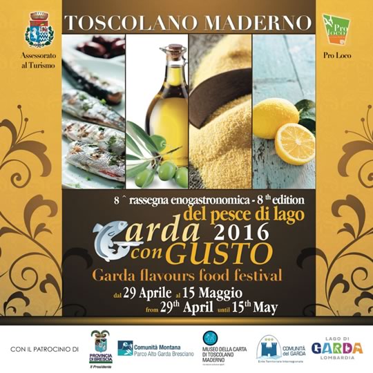 Da venerdì 29 aprile a domenica 15 maggio 2016, l’ottava edizione della rassegna enogastronomica del pesce di lago di Toscolano Maderno “Garda con gusto” vede trionfare i prodotti tipici della tradizione locale: gli amanti della buona cucina e del buon vino, per 17 giorni, avranno modo di degustare su prenotazione dei menù a prezzi promozionali (compresi fra 30,00 e 40,00 Euro), potendo scegliere tra le variegate proposte enogastronomiche che ogni ristorante aderente garantirà per tutta la durata della manifestazione.