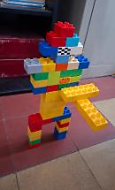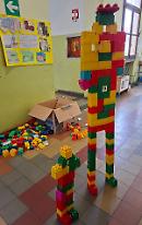 Niccolò Colla (6anni) e il fratellino Nathan (3 anni) davanti a una distesa di mattoncini colorati a Pieve Terzagni