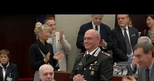 MILANO (16 aprile 2019) - "Tutti per uno e uno per tutti: avete saputo fare squadra e questo è stato importante". Consegnato stamattina, nella sala del consiglio regionale della Lombardia, al Pirellone di Milano, il riconoscimento del Sigillo Longobardo ai 51 studenti delle scuole medie Vailati coinvolti, il 20 marzo scorso, nel dirottamento dell'autobus che avrebbe dovuto riportarli a scuola, dopo la lezione di educazione fisica. Con loro, i docenti Alessandro Cadei, Giacomo Andrico e la collaboratrice Tiziana Magarini, che hanno vissuto quelle ore tragiche con gli studenti. E il sindaco di Crema Stefania Bonaldi e il collega di San Donato Milanese Andrea Cecchi e il tenente colonnello Paolo Abrate, comandante dei Carabinieri di Milano, che ha ricevuto il lungo applauso dell'aula e dei ragazzi tratti in salvo sai suoi uomini. Infine Marco Piuri, amministratore delegato di TreNord, che ieri mattina ha offerto il viaggio ai ragazzi da Crema a Milano su un convoglio riservato. A premiare le classi, il presidente del consiglio regionale Alessandro Fermi e il governatore della Lombardia Attilio Fontana. Presenti anche il colonnello Luca De Marchis del comando provinciale dei carabinieri e i consiglieri regionali del Cremasco Marco Degli Angeli, Federico Lena e Matteo Piloni.