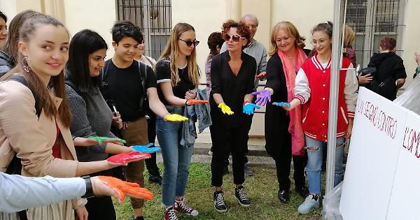 CREMA (17 maggio 2019) - Un segno contro la omotransfobia, per dire «no all’intolleranza nei confronti di gay, lesbiche e trans». Un gruppo di ragazzi che abitualmente frequentano la biblioteca Gallini, affiancato da amministratori comunali e responsabili dell’ufficio Orientagiovani, si è ritrovato ieri pomeriggio nel cortile di palazzo Benzoni per un’iniziativa promossa dall’assessorato alle Pari opportunità, guidato da Emanuela Nichetti. Preparata la pittura di vari colori e posizionati due pannelli bianchi con la dicitura «Un segno contro l’omotransfobia», i protagonisti si sono sporcati le mani di vari colori: dal blu al verde, dal giallo, al rosso, dall’azzurro all’arancione, per poi lasciare l’impronta del palmo.