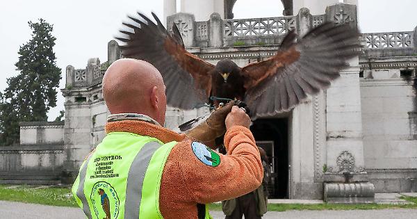 CREMONA - Il primo volo dei falchi anti piccione: storia di giovedì pomeriggio e di una operazione, quella voluta dall'amministrazione comunale che mira al contenimento dei volatili troppo numerosi - e troppo dannosi - al cimitero, che pur proponendosi come una vera e propria ‘caccia’ nei cieli sopra le tombe non sarà cruenta. ‘Naturale’, invece: specie contro specie. Bird control. Sperando funzioni.