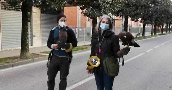 SESTO (1 marzo 2021) - Offensiva alata del Comune per far allontanare gli storni dal paese. Poco dopo le 17, nelle magnolie di viale Matteotti sono entrati in azione i falchi addestrati della ditta Falcon Fly di Traversetolo, nel Parmense. I rapaci, addestrati dalla falconiera professionista Jessica Ziveri, hanno cominciato l'operazione di allontanamento dei volatili dal paese per cancellare i disagi provocati dalle loro deiezioni, che da qualche settimana stanno lordando il tratto di viale compreso fra il bivio con piazza Garibaldi e la Casa Soggiorno Nolli-Pigoli. Presenti il sindaco Francesca Maria Viccardi e l'agente della polizia locale Alessandro Salimbeni. L'operazione continua anche domani e mercoledì.