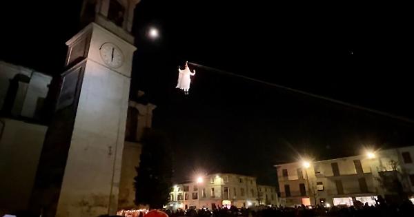 PIADENA DRIZZONA - Santa Lucia è scesa dal campanile della chiesa di Santa Maria Assunta, «volando» in una piazza Garibaldi piena di bambini che l’hanno attesa con un grande entusiasmo e l’hanno salutata all’atterraggio con un caloroso applauso. L’iniziativa, resa possibile nel tardo pomeriggio dal comando dei vigili del fuoco di Cremona supportato dal distaccamento dei vigili del fuoco di Piadena Drizzona, era molto attesa ed è stata confortata da un pieno successo. Il pomeriggio, a cura del Comune di Piadena Drizzona e delle sezioni locali Avis e Aido, è iniziato con l’apertura dei Mercatini di Natale allestiti nel chiostro dei Gerolamini. La piazza è stata poi animata con i canti e i balli dei bambini della scuola primaria Mario Lodi di Piadena Drizzona, coordinati come sempre dal maestro Francesco Badalotti, vestito da Babbo Natale. Pochi minuti prima delle 18 Santa Lucia, impersonata da Federica Raimondi, vigile del fuoco professionista in servizio permanente a Cremona, è apparsa nella cella campanaria. Come sempre si è fatto buio in tutta la piazza e la santa ha iniziato la sua discesa, illuminata da una fotoelettrica di uno dei mezzi dei vigili del fuoco. Una volta a terra, Santa Lucia è salita sul suo carretto trainato dall’asinello, circondata da una miriade di bambini.