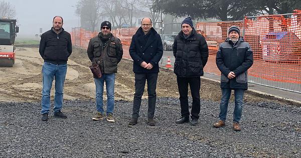 CASTELVETRO - Partito il cantiere per la riqualificazione viabilistica di via Kennedy, nell’area del polo scolastico: con un investimento di 280 mila euro sarà realizzato un nuovo parcheggio, il traffico sarà deviato nel quartiere Moro tramite rotatoria e nuova strada, in modo tale che lo spazio fra scuola e mensa diventi pedonale e verde. Si tratta della “Fase 2” del progetto Campus, dopo i lavori di riqualificazione energetica degli edifici, come ha spiegato il sindaco Luca Quintavalla. Che ha poi fatto il punto della situazione su tutti gli altri progetti del paese candidati ai fondi Pnrr. Presenti stamattina per un sopralluogo al cantiere anche i tecnici comunali Alessandro Amici e Ottavio Grossi, il vice sindaco Pier Luigi Fontana e l’assessore Valerio Demaldè.