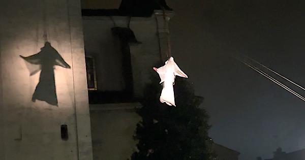 Prima del momento clou, il maestro Francesco Badalotti ha come sempre intrattenuto tutti i presenti insieme ai bambini della primaria con balli e canti di stampo natalizio. Alle 18.05 si sono spente tutte le luci dell’illuminazione pubblica e un faro ha illuminato la sagoma bianca della santa, che ha iniziato il suo ‘volo’ dalla cella campanaria al suolo. Un momento suggestivo, immortalato da tanti smartphone puntati verso l’alto mentre l’orologio del campanile non segnava l’ora giusta, perché è rimasto bloccato sulle 4 e qualche minuto.