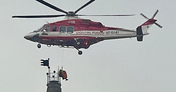CREMA - Colto da malore a mezzogiorno mentre si trovava in cima al campanile del Duomo. Un 59enne è stato soccorso poco fa dai vigili del fuoco che si sono calati dall'alto, grazie all'intervento di un elicottero. Non c'era altro modo per riportare in piazza il visitatore. Troppo stretta la scala che porta al castello della torre per consentire ai soccorritori di raggiungerlo. A terra il 59enne è stato caricato a bordo dell'autolettiga e trasferito al pronto soccorso di Crema. Centinaia di persone hanno seguito con trepidazione le fasi dell'intervento dell'elicottero dei vigili del fuoco.