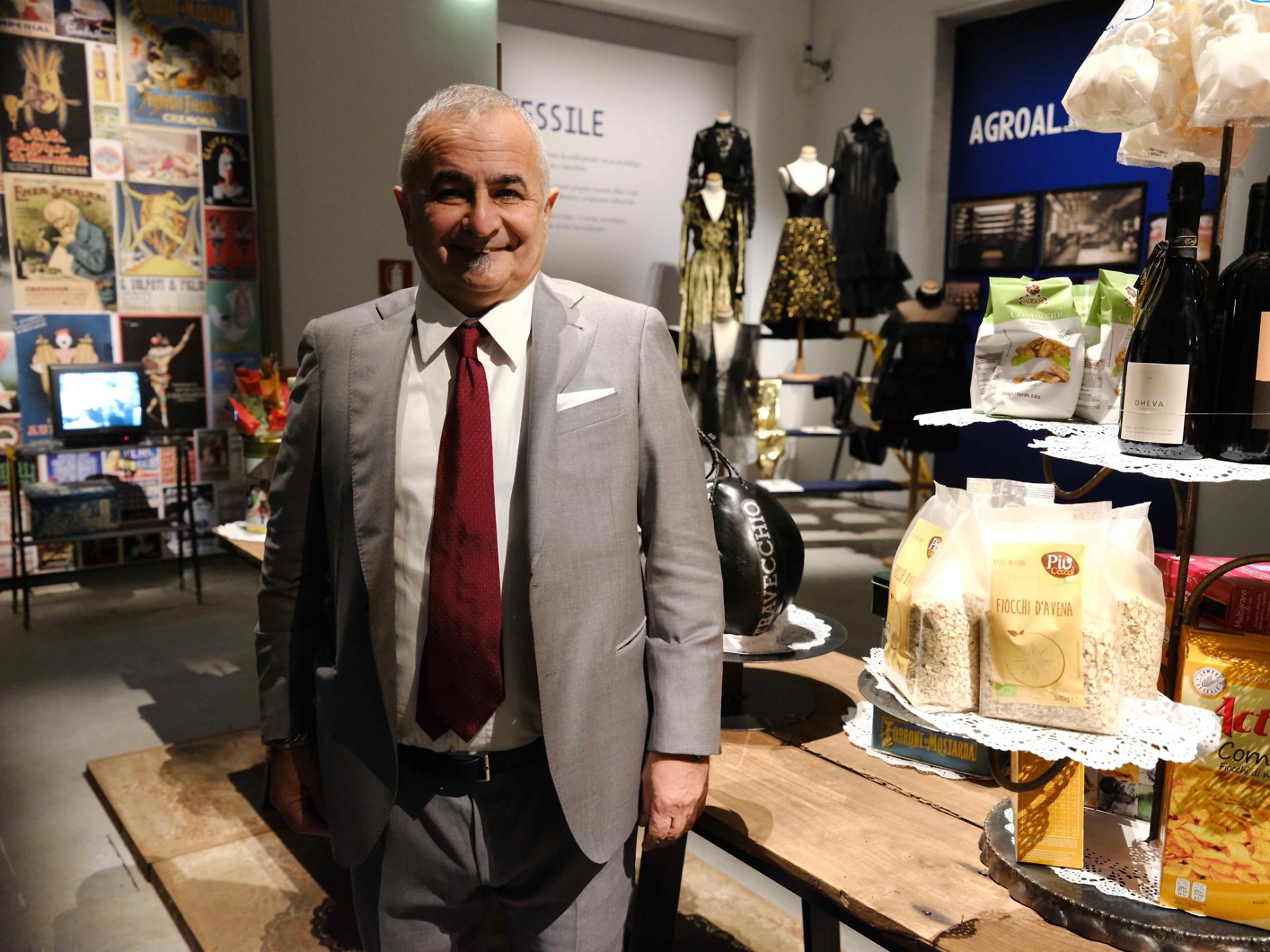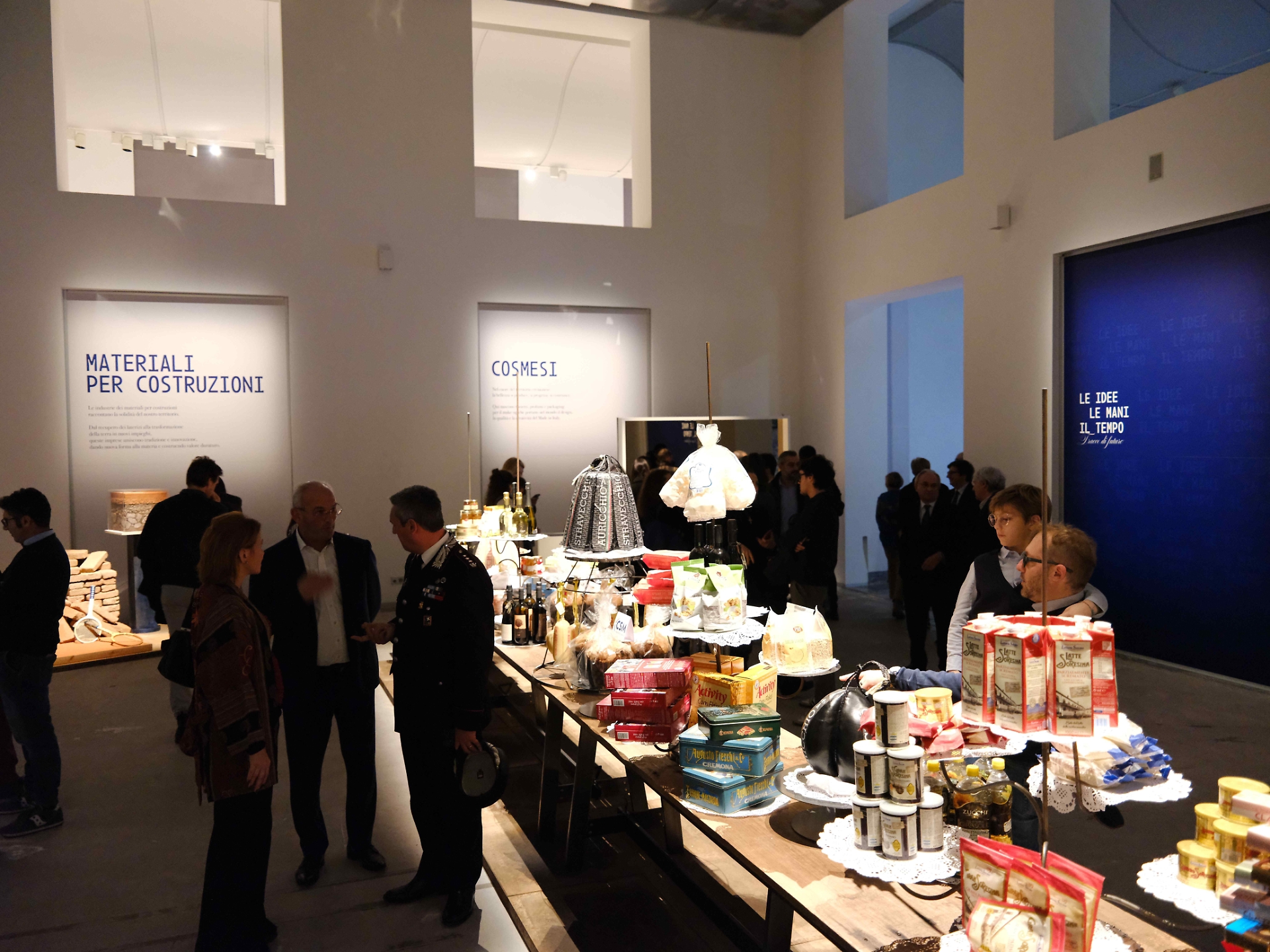 Più avanti i prodotti diventano i protagonisti indiscussi di un’efficace ‘fotografia’ del territorio: tutti i settori caratterizzanti del cremonese sono rappresentati dalle eccellenze tipiche delle industrie locali. Al centro della sala la scena è occupata dall’agroalimentare, con una lunga tavola imbandita con i prodotti del territorio, mentre sui lati trovano spazio i pannelli tematici e i prodotti dei comparti tessile, cosmetico, chimico e terre rosse.