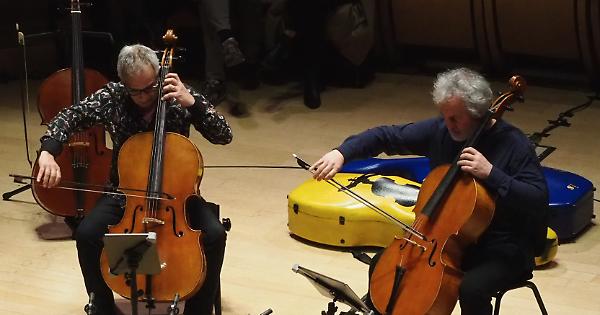 CREMONA - Inizia con un omaggio al popolo ucraino la prima serata all’Altra anima del violino, ieri sera nell’Auditorium di piazza Marconi. Mario Brunello e Giovanni Sollima hanno scelto infatti di suonare l’intera scaletta del loro concerto posizionando due custodie da violoncello proprio al centro del palco riproducendo la bandiera dell’Ucraina: l’una interamente gialla e recante l’iconico profilo della copertina di London Calling dei Clash (ma nella quale un violoncello prende il posto del basso), l’altra completamente blu e ornata dei soli versi «Questa terra è la tua terra», tratti dalla celebre canzone di Woody Guthrie. «Oggi abbiamo deciso di usare queste custodie» spiegano al microfono introducendo il concerto, salutati da un applauso.