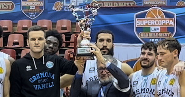 FORLI' - Andrea Pecchia, capitano infortunato, come Travis Diener. Dopo tre anni la Vanoli Cremona torna ad alzare un coppa. Il 17 febbraio 2019 era la Coppa Italia di serie A, ora il valore del trofeo è decisamente meno importante ma dà lustro alla società.
