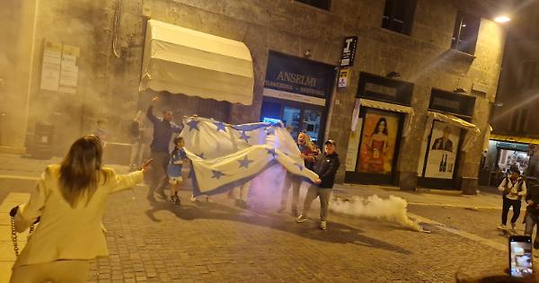 CREMONA - Il Napoli è campione d'Italia dopo 33 anni. I tifosi partenopei esportati a Cremona sventolano bandiere azzurre per le vie della città. Tra cori e feste, il ricordo di Maradona è vivo anche sotto il Torrazzo.
