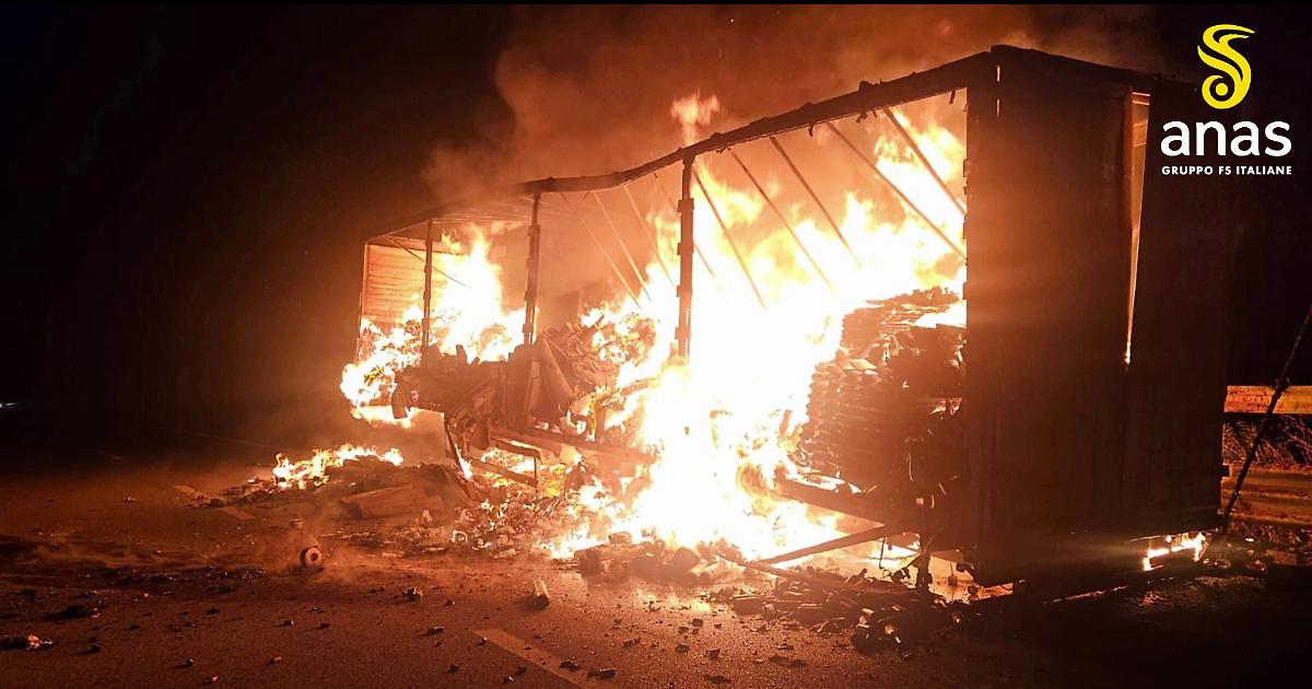 Mezzo pesante in fiamme sull'A19, illeso il conducente
